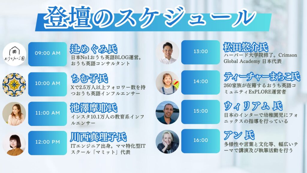本イベントでは、日本に住む親御さんが、お子さまの将来におけるグローバルな教育や英語力をどのように育んでいけばよいのかについて議論を深めます。また、教育の専門家やインフルエンサーから、「今すぐ始めるべき具体的なアクション」についてのアドバイスもお届けいたします。