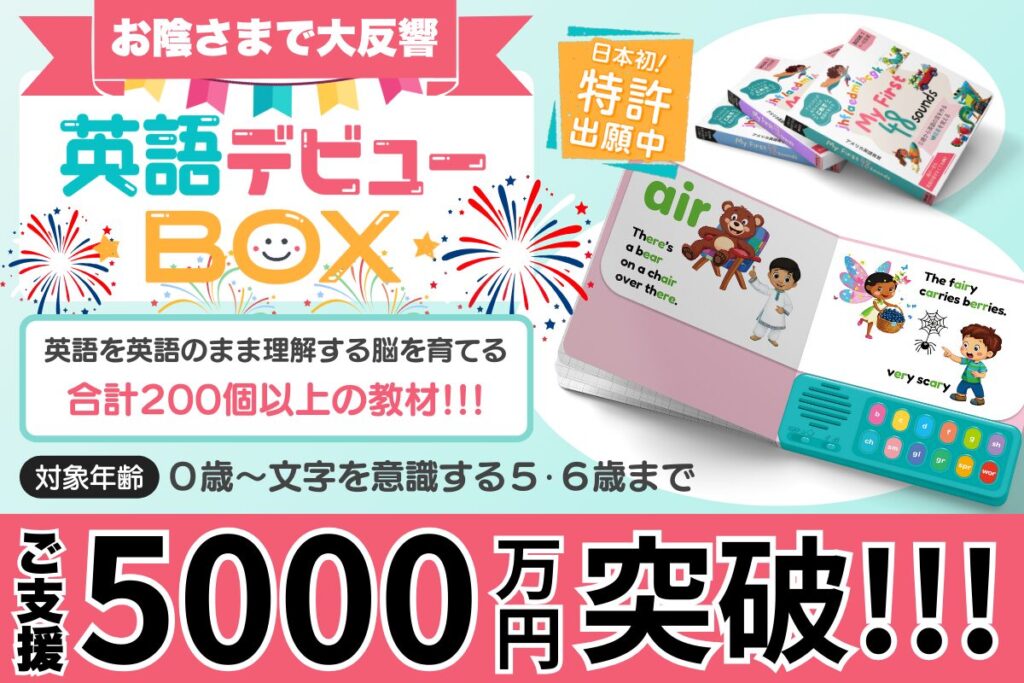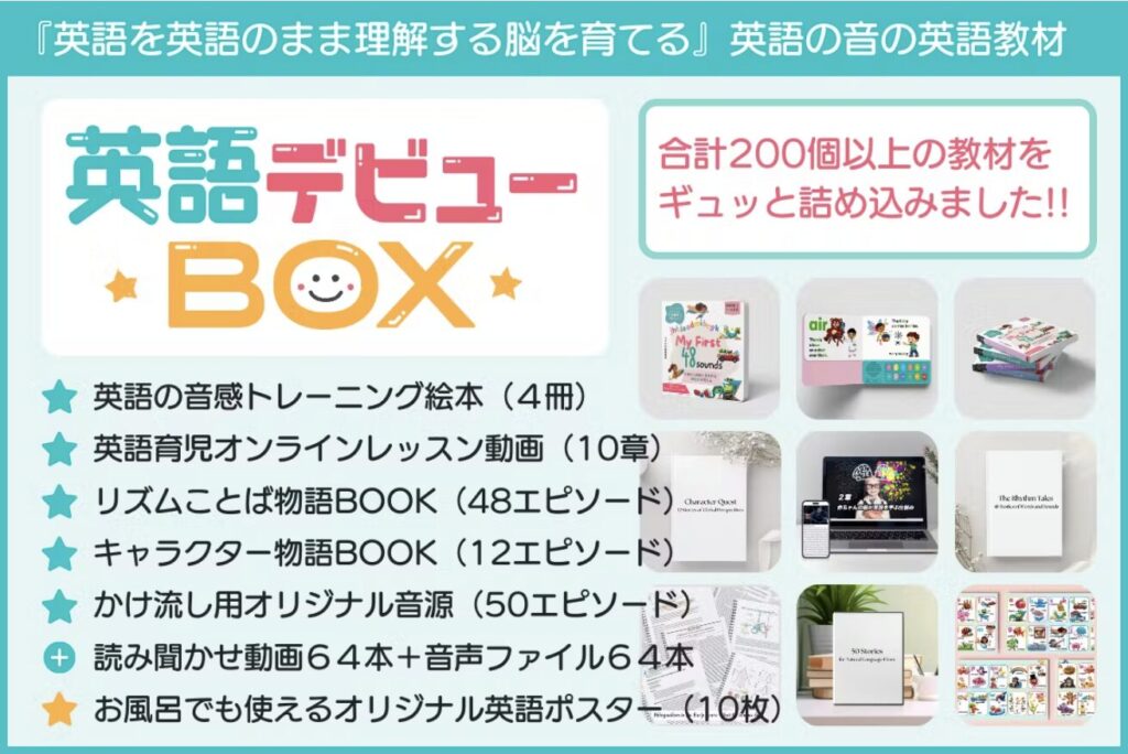 2024/10/25に、英語の全ての「音」に特化した日本初!特化出願中『英語デビューBOX』の先行予約販売を開始致しました。英語デビューBOXは、脳科学が証明する0〜6歳児を対象に、200個以上の「英語の音」に特化した教材がギューと詰まっている全く新しい英語教材です。予約先行販売は、12/28まで行っており、以下の200個以上の教材は、一般販売価格の30%OFF(2024/12/09付け)の23,101円でご購入できます。